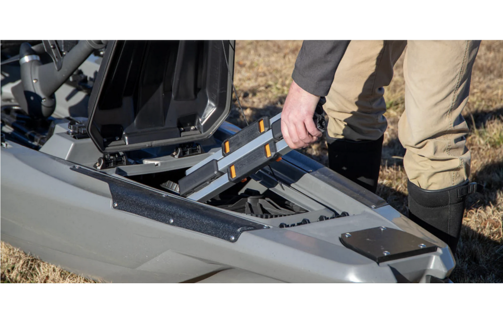 So, you’re at the launch, now what? Sometimes it’s not convenient to take your cart back to your vehicle, and doing so leaves your kayak and gear unattended and susceptible to theft. We solved this problem by making the BarCart ultra collapsible. The wheels can be removed with the push of a button. The bunk bars, long enough for even the widest fishing kayaks, collapse with a heavy-duty ferrule and bungee system, enabling them to go from a 44” deployed length to less than 18” in a compact and secure package. The uprights fold down, parallel with the axle, making it possible to store the BarCart inside the hull of a kayak. All of this can be performed with no tools using smart and simple buttons and levers. If needed, everything minus the centralized tiedown point can be removed from the aluminum axle.